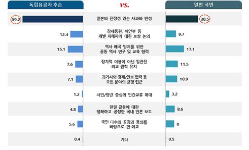 · 후손과 국민 모두 70% 이상이 친일 잔재 ‘청산되지 않았다’ 응답... 한일관계 개선의 핵심 조건은 ‘일본의 진정성 있는 사과와 반성’