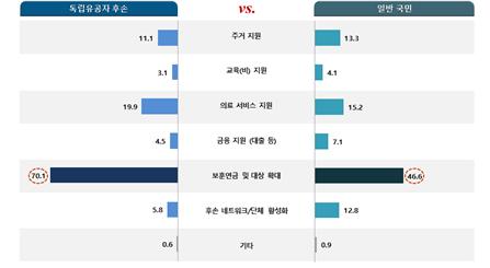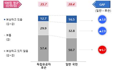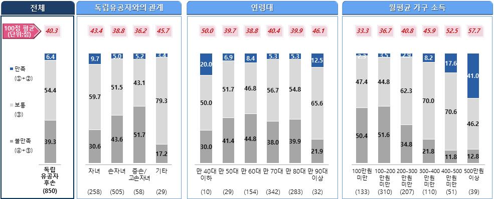 □ 또한 독립유공자 후손과 일반 국민 모두 국가의 보훈 보상과 예우 수준이 여전히 부족하다고 답했다. 광복 80주년인 2025년 현재의 생활 만족도는 6.4%로 매우 낮았고, 세대가 멀어질수록 불만족도가 높았다 (독립유공자의 자녀 30.6%, 손자녀 43.6%, 증·고손자녀 51.7%). 독립유공자 후손과 일반 국민 모두 '보훈연금 및 지원 대상 확대'를 최우선 정책 과제로 꼽았으며, 해방 이후 친일 잔재가 청산되지 않았다는 인식이 대다수였다.