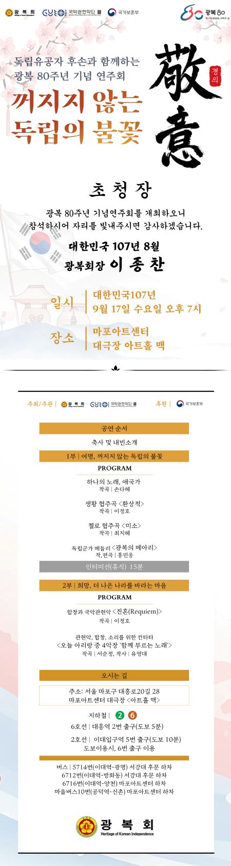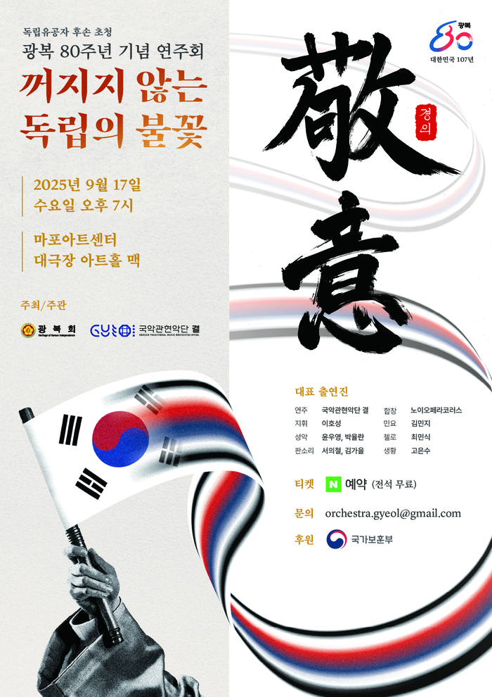 □ 광복회(회장 이종찬)와 국악관현악단 ‘결’(대표 이호성)이 공동으로 주최하는 광복 80주년 기념 연주회 <꺼지지 않는 독립의 불꽃, 경의>가 오는 9월 17일(수) 오후 7시 마포아트센터 대극장 아트홀 맥에서 개최된다.